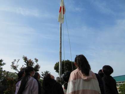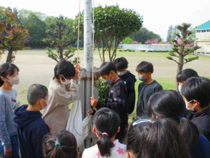丘の仲間委員会の児童は、朝のあいさつ運動の他に、国旗掲揚の役割もあります。今朝は、あいさつ運動の後、全メンバーで、国旗の前に集合して、昨年度に引き続き丘の仲間委員の児童が、国旗の揚げ方をレクチャーしていました。自分たちがしてもらったことを、しっかりつないでくれています。ありがとうございます。