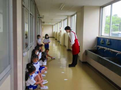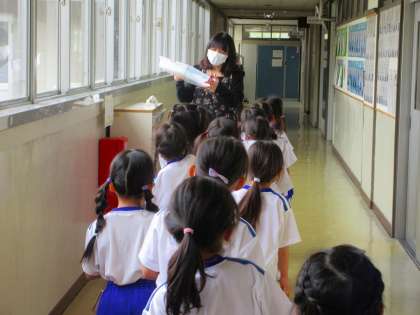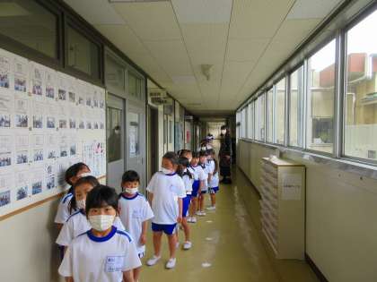 午前中に、検診センターの方々が来校され、検診会場を作成してくれました。準備が整うと男女別に検診がスタート。中の様子はドアが閉まっていて見ることができないので、廊下で待つ子供たちは、はやる気持ちを抑え、静かに並んで待っていました。検診後は、プチ探検として、保健室の出席黒板やお便りボックスを先生に教えてもらっていました。