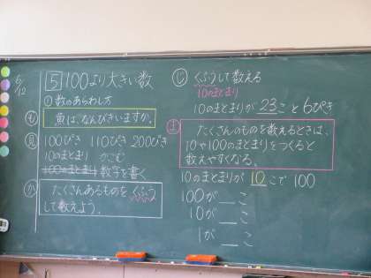 これまでの学習を生かして、数の構成や表し方、読み方について考えたり、より大きな数の表し方について発展的に考えたりする単元です。子供たちにとって、身の回りで、100よりも大きい数はよく目にしていますが、どんな場面でその数が使われているのか、見つけたり、数の表し方や読み方はどうかな?など興味をもって取り組んでほしいです。
