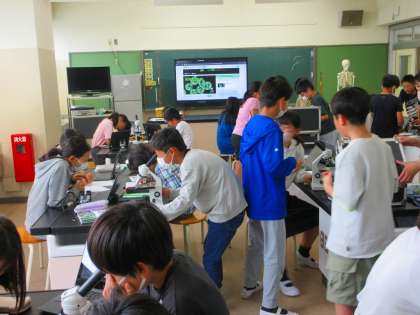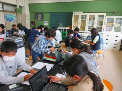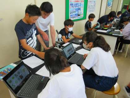 いろいろな動物がそれぞれどのような生物を食べているか考え、気付いたことを話し合ってきました。今日は、「メダカがどんな食べ物を食べているのか」の問いに、子供たちは「微生物」と予想し、具体的な微生物について、一人一人タブレットで深く掘り下げて調べていました。調べた微生物を、PCの画像で確認するだけではなく、電子顕微鏡を使って(プレパラート資料を)観察していました。