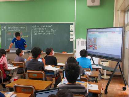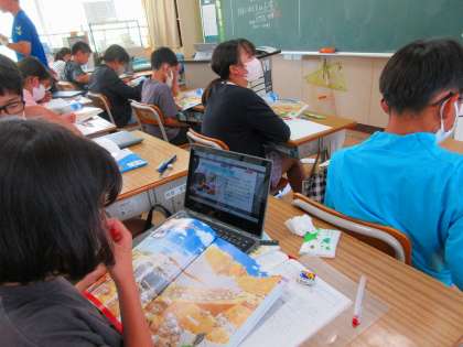 本時の課題「古墳は何のために、どのようにして作られたのだろう」について、子供たちがそれぞれに予想して、調べ、まとめたプレゼン資料を見て、友達の考えをシェアしていました。「古墳には様々な形がある」「石で敷き詰められている」「古墳の回りにははにわ、中には、勾玉・土器・剣などが納められている」「建設費は、今のお金に換算すると800億円かかる」など自分が調べてきた内容がさらに深まった様子でした。