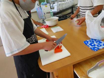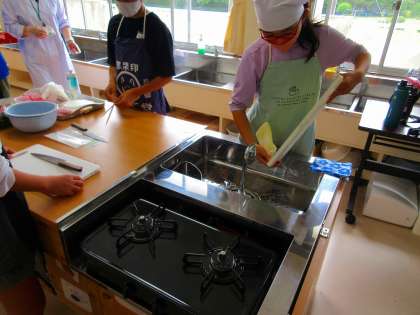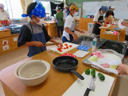 待ちに待った調理実習です。調理に使う用具を出し、用具をすべて洗います。この段階では、かなり緊張気味の様子でした。野菜を手にすると、野菜を洗い、タマネギの皮をむく人、ピーマンの種を取る人、にんじんを切る人など役割を分担しながら、サクサクと活動が進んでいきました。「こんなに美味しい野菜炒めができた!」と大満足の様子でした。