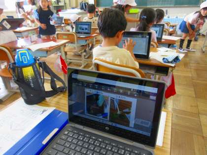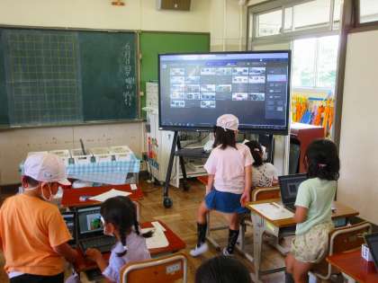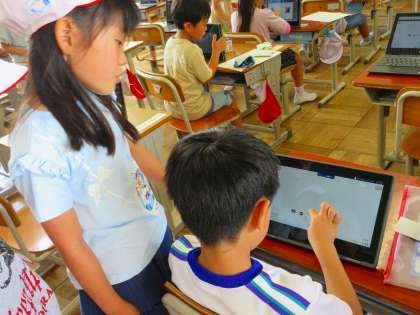 一人一鉢育てているアサガオの世話を子供たちはとてもよくやっています。この他に、教室では牛乳パックで「おしろいばな」と「ひまわり」の種を植え、成長の様子を観察しています。2つの植物を写真に撮り、その写真を先生が作ってくれたワークシートに貼り付け、「どんなところが似ているか」「何が違うのか」について、友達と話し合っていました。また、タブレットの扱いも、かなり上達しています!