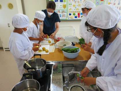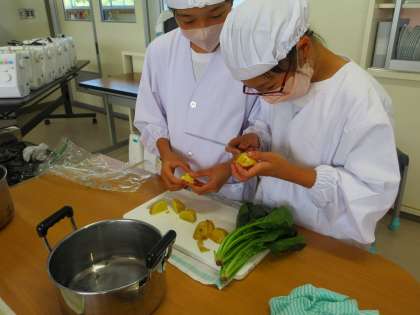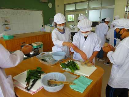 今日は2組さんが調理実習です。手際よく調理道具や野菜を洗って、切る作業に入っていました。ジャガイモは皮がむきにくいので、4つに切ってから皮をむくなど、工夫している班がありました。役割を上手に分担して、協力してがんばっていました。