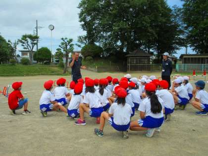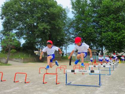 学年合同のハードル走の学習です。ハードルに恐怖心のある児童には、トレーニング・ミニハードルのコースを用意していました。(1)決めた足で踏み切ってハードルを走り越える。(2)体のバランスをとりながら最後まで真っ直ぐ走る。(3)インターバルは3歩または5歩で走る。この3つは、これからの練習をとおして、少しずつできるようにがんばろう。