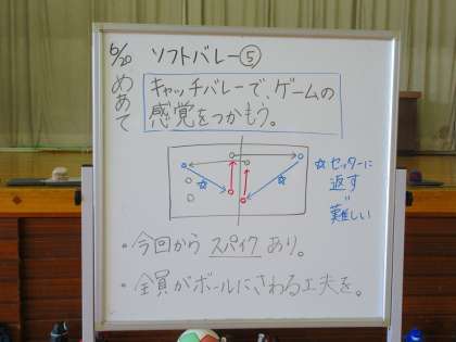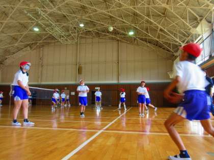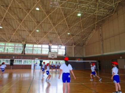 体育館で、ソフトバレーボールの学習をしていました。本時のめあては「キャッチバレーで、ゲームの感覚をつかもう」。準備運動では、ボールに慣れるために、円陣を組んで練習をしました。ネット越しに相手チームとミニ試合に挑戦し、ラリーが続くように一人一人がんばっていました。