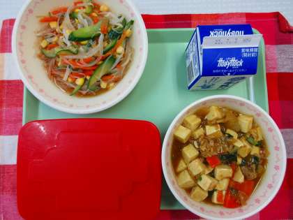 【献立】ごはん 牛乳 豆腐のカレー煮 春雨サラダ