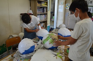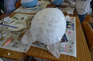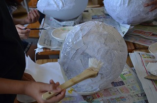風船を土台に、紙粘土や段ボール紙を貼り付け、彩色を行い、創造性豊かな作品を完成させていました。