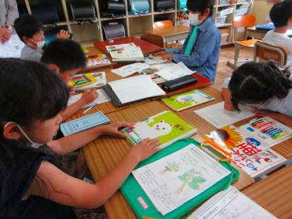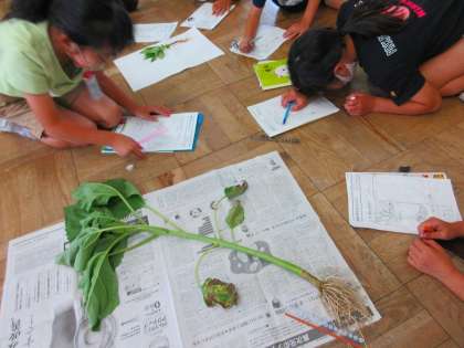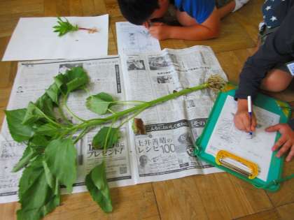今日は、あいにくの雨なので、教室に「ひまわり」「ホウセンカ」の2つの植物をもってきて、学習を行っていました。子供たちは、2つの植物の葉・茎・根の様子を、熱心に観察し、スケッチしていました。