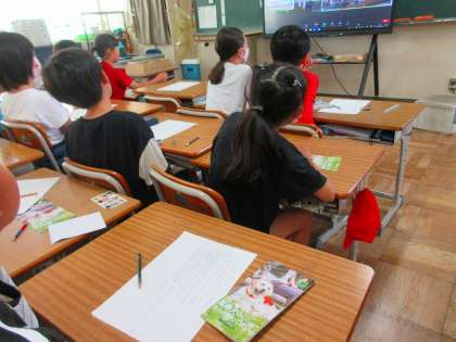 視覚障害ってどんな見え方?」「視覚障害者ってどんな生活をしているの?」「どうやって目的地に行くの?」「何かお手伝いしたほうがいい?」など、盲導犬をきっかけとして視覚障害への理解を深めるために、今年度初めての試みの「オンライン盲導犬教室」に応募しました。今日は31校が参加。全国各地の小学校でも、福祉のことを学んでいることを知り、子供たちの意欲は一層高まりました。先生から配られたワークシートの裏面までしっかりメモをとっていて、子供たちの主体性に感心しました。