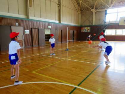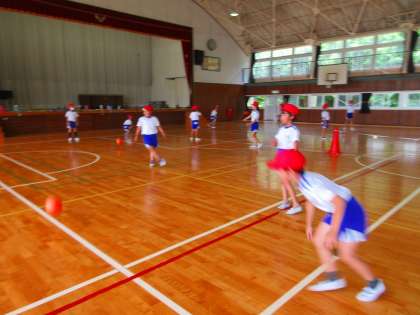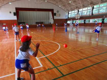 今年度より水泳学習は、民間スイミングスクールに委託になったので、学習内容を入れ替えて実施しています。3年生はボール運動「プレルボール」に取り組んでいました。ボールに慣れたり、ルールを理解したりの段階ですが、チームの仲間と協力して、一生懸命取り組んでいました。