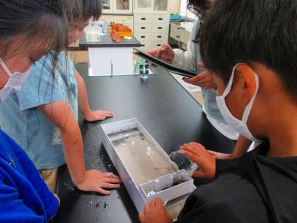 前時にビオトープ脇で行った実験で"生まれた課題"を解決する時間です。課題「流れる水には、浸食、運搬、堆積のはたらきがあるのだろうか」を、3つの視点に分けて実験をしていました。○流れが速いところ、○曲がっているところ、○流れが緩やかなところを見るために、何度も斜面を作り直しては水を流して、班の友達と考察をしていました。