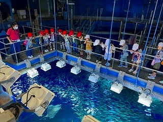 イルカショーの後にたっぷり館内見学をしました。お昼前には、予約していた「バックヤード見学」も楽しめました。お弁当とおやつタイムは、グループ毎に仲良く楽しく、美味しくいただきました。お弁当の後も、たっぷり館内見学や屋上からオーシャンビューを満喫することができました。