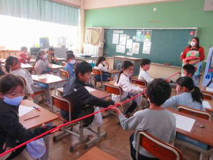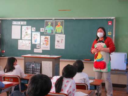 市毛小学校の栄養教諭の先生に来校していただき、食育の学習を行いました。3年生の学習課題は、「早ね早おき朝ごはん」です。腸の働きについて学んでいるときに、実際の長さを知るために内臓モデルを使って、腸をピーンと伸ばしてみると、子供たちから「わーすごい!」「長い!!」と歓声が上がりました。朝ご飯の大切さをしっかり学ぶことができました。