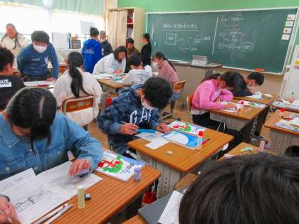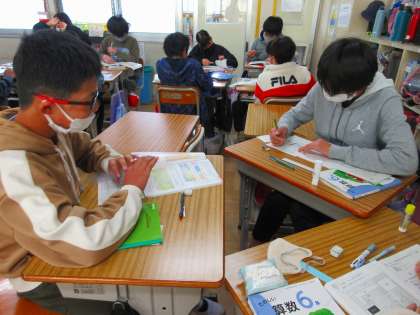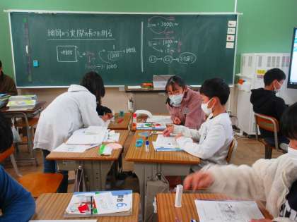 今日の課題は「縮図を利用して、実際の長さを求める」です。自力解決後、班の友達の考えを聞きながら、よりよい考えを出し合っていました。