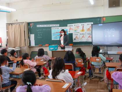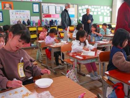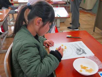 栄養教諭の先生(市毛小学校)が来校し、食育の学習をしました。1年生の課題は「お箸の使い方」です。お箸の役割を学んだ後に、指定された場所(ワークシートのイラストの中)に乾燥マカロニを運ぶゲームをしました。薬指は伸ばし、中指を上手に動かす動きを意識して取り組んでいました。今日は、学校運営協議会の委員の方々にも授業の様子を見ていただきました。日頃、お世話になっている地域の方々が来ていたので、子供たちはさらに緊張しながら,お箸を使ったゲームに取り組んでいました。