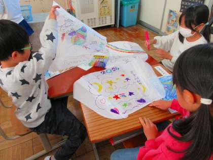 高学年は、1.2時間目は学力診断のためのテストを行っていますが、低学年の子供たちも、冬休み気分はすっかり抜けて、学習モードになっています。(1年生の様子)音楽の授業では、タブレット鍵盤で鉄琴の音色で「きらきら星」を演奏していました。また、図工の授業では、凧づくり。思い思いの絵柄をマジックインキで書いていました。