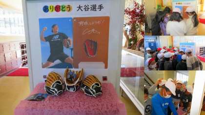 1/12(金) 大谷選手からの素敵なプレゼント 公開日 2024/01/12 更新日 2024/01/12 その他 本校にも、大谷選手からのグローブが届きました。子供たちが昼休みに見たり触れたりできるように、昇降口前に展示しました。遊びに行くために階段を降りてきた子供たちがグルーブに気付くと、歓声が湧き上がっていました。手を叩いて飛び上がったり、「ありがとう!!!」「大谷選手最高!!!」など連呼したりするなど、からだ全体で喜びを表現していました。