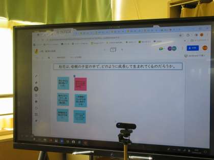 今日の課題は「胎児は母親の子宮の中で、どのように成長して生まれてくるのだろうか。」です。子供たちはグループ毎に予想をたてるとJamboardに書き込みました。その後、班の友だちとタブレットを使って、動画を見たり、ネット検索したりしながら課題解決をしていました。