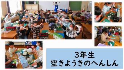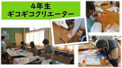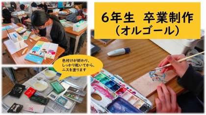 写真は、3年生、4年生、6年生の図工の様子です。3年生は、粘土マイスターを講師に迎え、粘土の扱い方や、色付けの仕方などを学びました。4年生は、のこぎりやヤスリ、金槌などを使って、思い思いの作品を作っていました。6年生は卒業制作のオルゴールづくり。各面に下書き⇒彫り⇒色付け⇒ニス塗りのたくさんの工程のある制作に没頭していました。