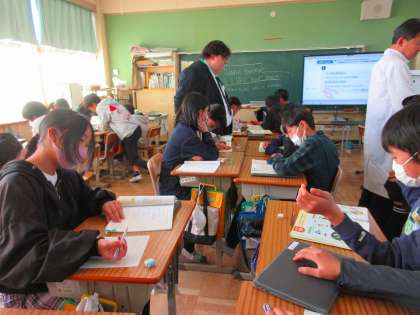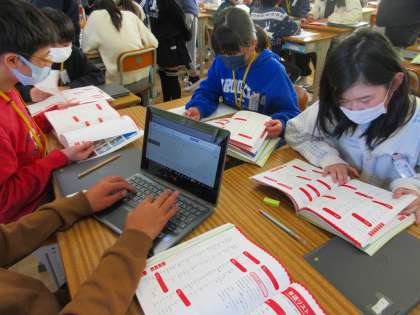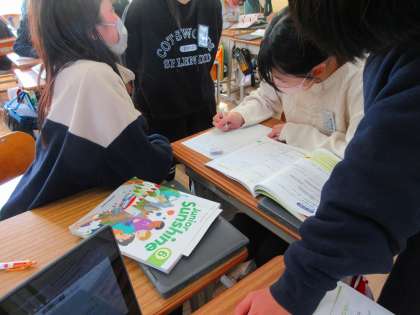 Project2のテーマは「感謝の気持ちを伝えよう」です。この学習のめあては「1.感謝の気持ちの伝え方を理解しよう」「2.感謝の気持ちを伝える手紙を書こう」「3.お世話になった人に感謝の気持ちを伝えよう」の3つがあります。今日は2つめ「手紙を書く」活動をグループの友だちと協力し、試行錯誤しながら意見を出し合いながら取り組んでいました。