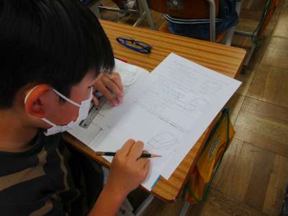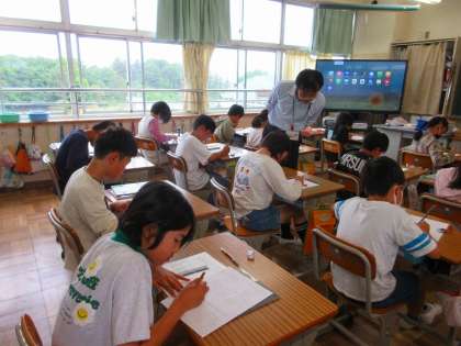 授業の終末に、適用問題(複合図形の求積)に取り組んでいました。茨城県で行っている「学力診断のためのテスト(過去問)」や「いばらきフォローアッププ問題」を授業時間内に活用することで、子供たちの学習意欲や思考力、判断力、表現力等を育成し確かな学力の向上をねらっています。