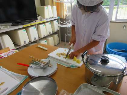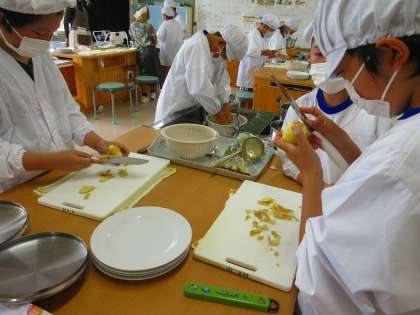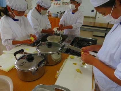 「青菜のおひたし」と「ゆでいも」づくりです。今日初めて庖丁を持った児童もいたようで、恐る恐るジャガイモの皮を真剣に剥いていました。11月に予定されている宿泊学習では、カレー作りをするので、今日上手くいかなかったところをお家で練習し、5ヶ月後には自信をもって野菜の下ごしらえができるように、「がんばろう!!」という意欲がもてたようです。