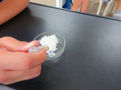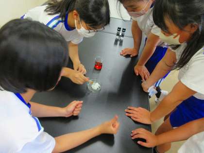「デンプンと唾液の働きの関係を調べる。」の学習で、唾液には、デンプンを変化させる働きがあることを捉えます。写真は、ごはん粒には、デンプンが含まれていることを確認している様子です。