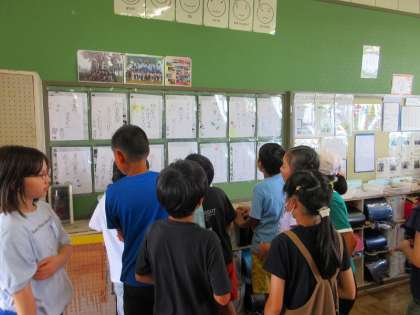 一人一人が日常に目を向けて、感じたこと思っていることなどを十七音の文字に収めました。友だちの作品を鑑賞していました。学校生活、家庭生活、食生活など様々な視点で自分の思いを伝えられています。