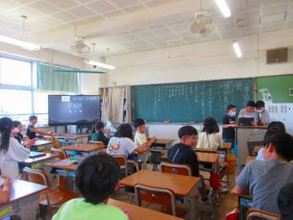 3ヶ月間の係活動を振り返って、自分たちが取り組んできたことを発表していました。5年生のこの学級には、7つの係があります。給食係は紙芝居、新聞係は自作の絵本、お笑い係はショートコントなど、それぞれ思考を懲らした内容と発表スタイルで、自分たちの取組を伝えていました。