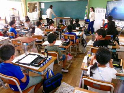 7/16(火) 書写「毛筆」〜3年〜 公開日 2024/07/16 更新日 2024/07/16 その他 毛筆一年目の3年生は、GTの先生が来校し、ご指導をいただいています。今日は夏休み前最後の授業です。一人一人熱心に取り組んでいました。