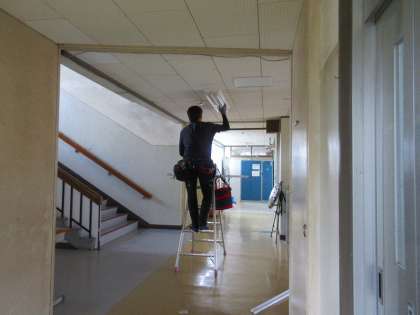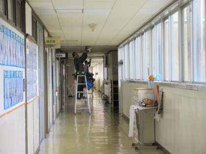 校内の全ての蛍光灯をLEDライトに入れ替える工事が、本日よりスタートしました。教室内は、授業を行ってるので、先ずは廊下や本日使用予定のない特別教室から、交換工事が始まっています。