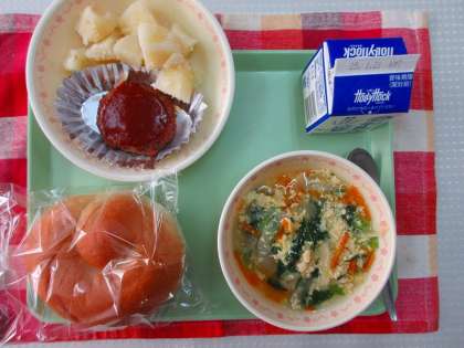 【献立】ミルクパン 牛乳 ハンバーグデミグラスソース こふきいも イタリアンスープ