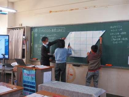 子供たちは、既習の長方形の面積の求め方を活用すれば、平行四辺形の面積も計算できるのではないか!と課題意識をもって、本時の学習に取り組んでいました。タブレットを使って、平行四辺形の面積の求め方を考え、なぜそのように考えたのか、だれもが説明することができました。最後に、大きな図形(板書)で再確認し、学習のまとめをしました。