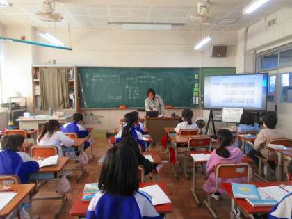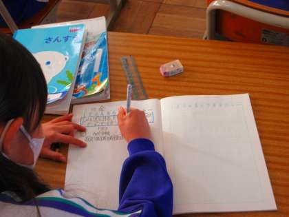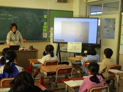 本時の学習問題は「1400は、100をいくつ集めた数ですか」です。子供たちは、自分のノートにどのように考えたか、図を使って説明するなど、一人一人しっかり考えていました。電子黒板に考えの異なる児童のノートを写しだし、比較検討している場面です。本時の学習を通して、子供たちは、何千何百を 100のいくつ分と捉えることができるようになりました。