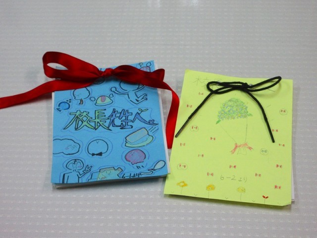 中休みには、1組、2組の児童が直接、全員の先生に「メッセージ」のプレゼントを手渡してくれました。子どもたちの心遣いに感動し、また寂しさが募ってしまいました。