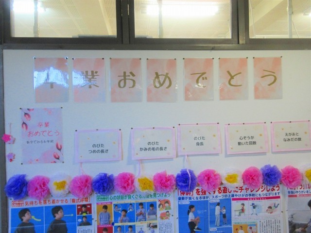 保健室の廊下掲示は、【卒業おめでとう 数字で見る6年間】に入れ替わりました。6年生の保護者の皆様は、ぜひ卒業式の日に、ご覧になってください。