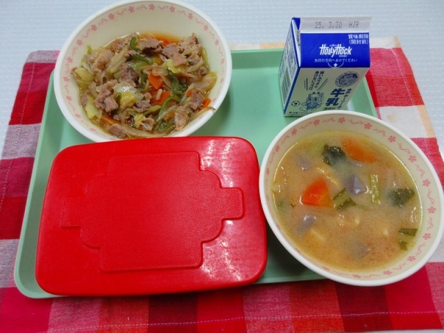 【献立】ごはん 牛乳 豚肉と野菜の生姜炒め みそけんちん汁