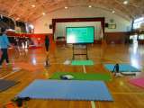 体育館のカーテンを閉めて日差しを遮り、窓を開けて風が入るようにし、さらに扇風機で...