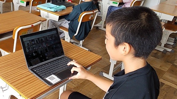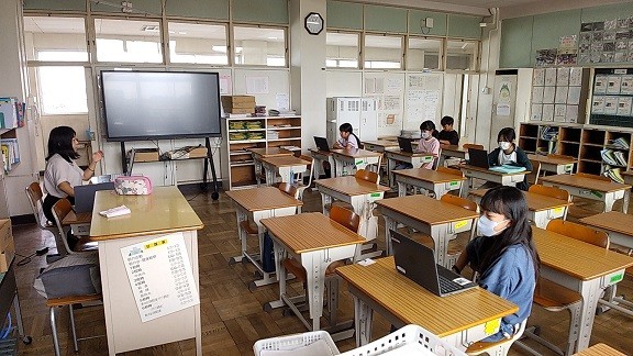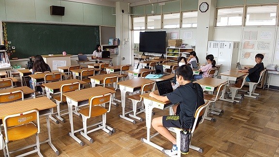 本日は、担任の都合により5年4組が一足先にオンラインホームルームを行いました。学童に来ている児童は、教室で参加しました。久しぶりに友達の姿を見て、みんな喜んでいました。