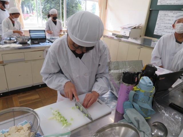 耐熱ガラス鍋でご飯が炊ける様子にドキドキし、みそ汁の具材をハラハラしながら包丁で切り、協力して活動しました。