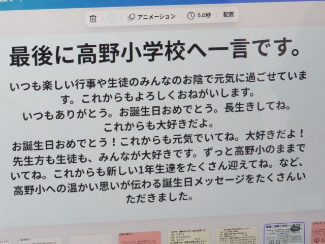 昼の校内放送では、記念日ウイークのフィナーレとして、高野小学校の魅力紹介と誕生日メッセージの発表があり、最後に「大好きな高野小学校をみんなで守り、大切にしていきましょう」というアナウンスが流れました。そして、24日に続いて、牛乳で乾杯し、記念日ウイークの幕を閉じました。