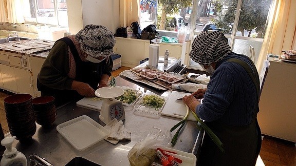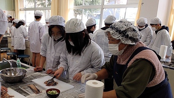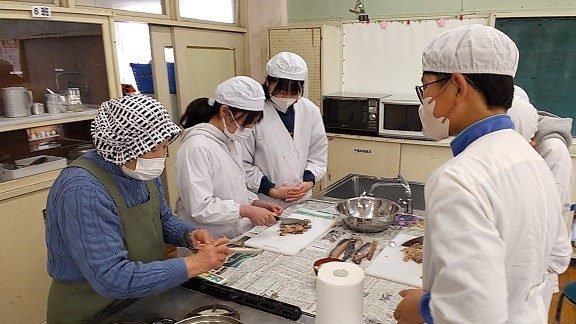 6年生が、市の水産課の協力により、地魚を使った調理を体験しました。那珂湊漁業協同組合女性部のお二人が、朝早くから仕込んでくださった地元産の鯖を、おいしいつみれ汁にしていただきました。