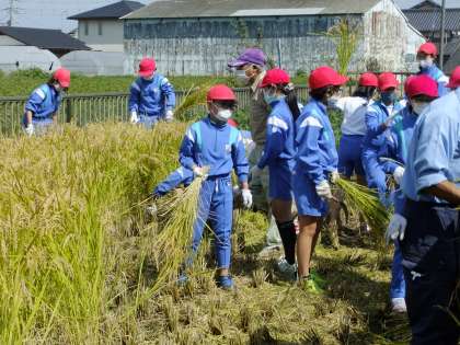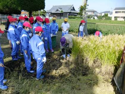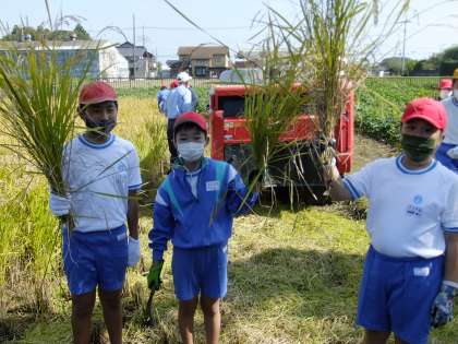 秋空のすがすがしい天気の中,5年生が,地域サポーター清水さんのご指導のもと稲刈りをしました。初めてののこぎり鎌をおそるおそる使い出しましたが,慣れてくるとどんどん刈り進めました。このような豊かな体験ができるのも地域の方の協力があってのことです。