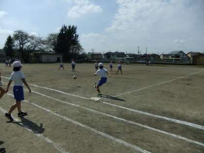 4年生は,体育で1学級が4チームに分かれてキックベースボールをしていました。チームで作戦を立ててみんな楽しそうです。学校の授業は楽しいことをしみじみ実感できます。
