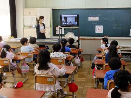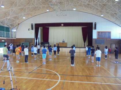 全校児童700名が集まることは難しいため,体育館の式を各学級に中継する方法で前期終業式を行いました。教室に大型モニターは設置されていないことと,接続コードが全クラス分購入できないため(予算上)1・2年生のみテレビに接続し,他学年は,2〜4人でタブレットをひらいて,中継を見ました。体育館には,6年1組が代表して式に参加しました。6年生として大変立派な態度で参加できました。また,教室もとてもよく話を聞いていたようです。月曜日の始業式は,もっと顔がよく見える放送室から中継します。