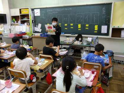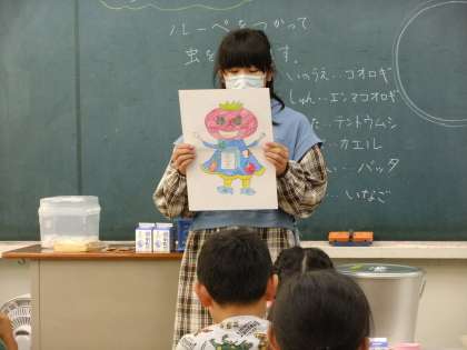 今日の給食にはタイムリーなメニューで「サツマイモのソテー」がでました。(学校で掘った芋ではありません)そして,給食委員会の皆さんが「給食ちゃん」としてサツマイモのワンポイント説明に教室にきました。1・2年生は,サツマイモに関することなので,特によく聞いていました。