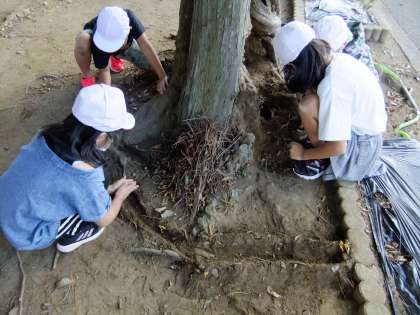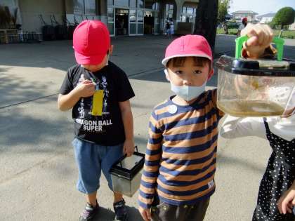 秋晴れで,気温も過ごしやすく,休み時間はたくさんの子ども達が外で遊んでいます。1年生は,虫取りに夢中です。石を持ち上げて何かを発見。カエルやトンボ,バッタも見つけています。家に連れ帰りたいようですが,今日は,荷物があり・・・難しいかも。