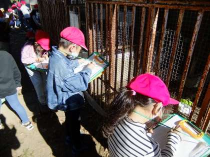 1年生は,今日は,学校の動物を調べていました。池をのぞいて鯉の絵を描きながら鯉に話しかけていました。ウサギ小屋では,4羽いるウサギを見比べて模様の違いを見つけて絵に描いていました。タブレットで見るのと,実物は違います。実物を見て感じることが大切です。1年生は遠足で大洗水族館へ,2年生はかみね動物園を予定しています。いろいろな生き物と触れ合いを大切にしたいです。
