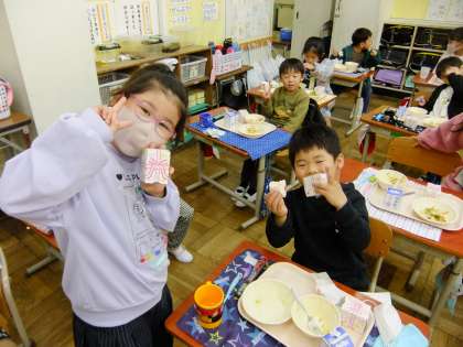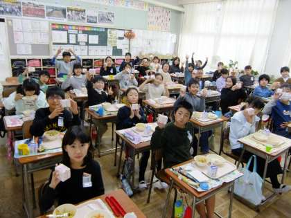 創立50周年記念献立として,50周年実行委員会からお祝いのケーキをいただきました。本当は,今週,式典を予定していましたが1月に延期になりました。そこで,給食委員会から今日の特別なケーキについて放送が入りました。みんな笑顔でとてもおいしそうに大事にいただきました。朝からケーキを楽しみにしていた子もたくさんいました。今日は,いつもよりお休みの子が少なかったようです。